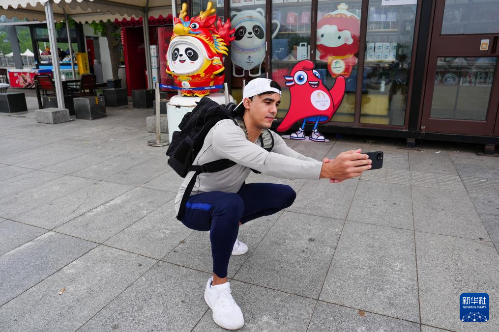 7月14日,在北京奥林匹克公园,兰佩丝结束训练后与北京冬奥会吉祥物冰墩墩、巴黎奥运会吉祥物“弗里热”自拍合影。法国人兰佩丝在北京生活工作多年,他是一名计算机工程师,同时也是一名马拉松爱好者,每周都会到奥森公园进行训练。