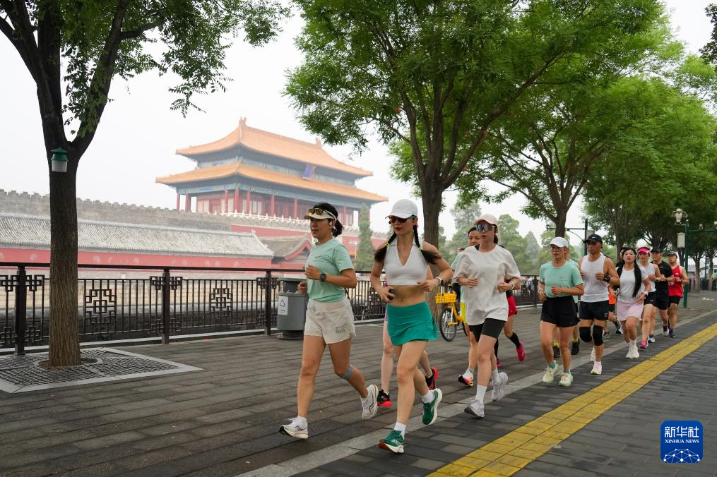 6月22日,跑步爱好者余伊婷(左四)和其他跑步爱好者们跑过故宫神武门。30岁的余伊婷在跟着朋友跑了一次“故宫跑”后,她就喜欢上了这条北京中轴线上的经典跑步线路,几乎每周六都要来跑一次。