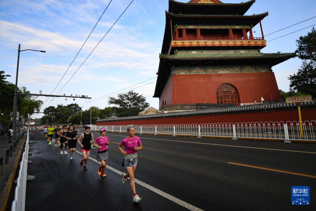 7月20日,跑步爱好者经过北京鼓楼。