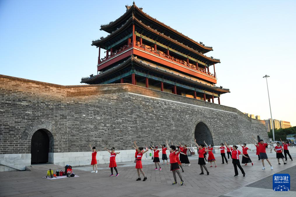 7月17日,市民在永定门城楼下跳广场舞。