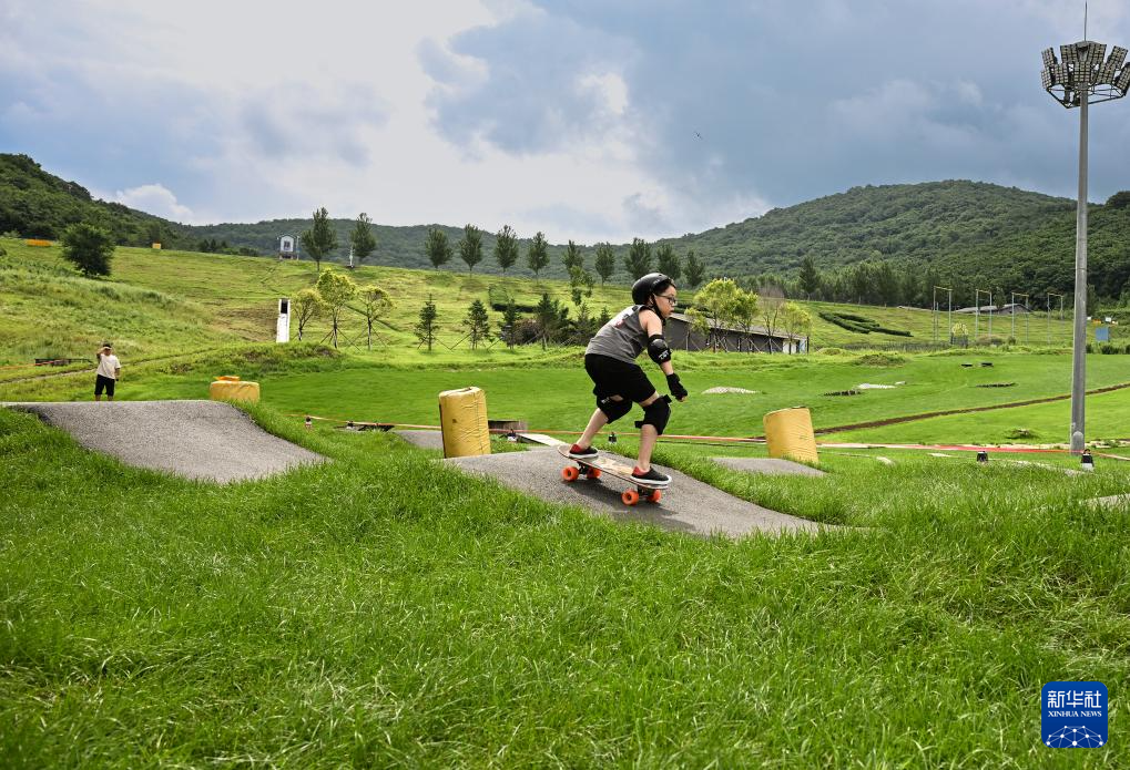 吉林松花湖滑雪场内利用场地举行滑板活动,吸引许多小滑手们来到这里竞技(8月3日摄)。