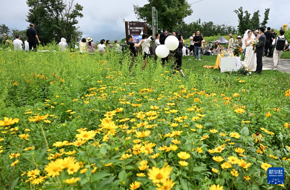 在吉林松花湖滑雪场内,一对新人婚礼利用山间滑雪道旁的场地举办(8月3日摄)。