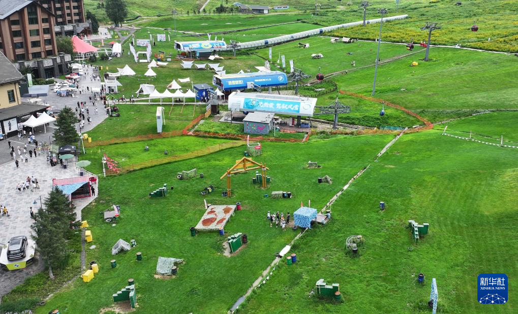 吉林松花湖滑雪场内利用场地开展丰富多彩的户外活动,吸引不少游客前来观光游览(无人机照片,8月3日摄)。