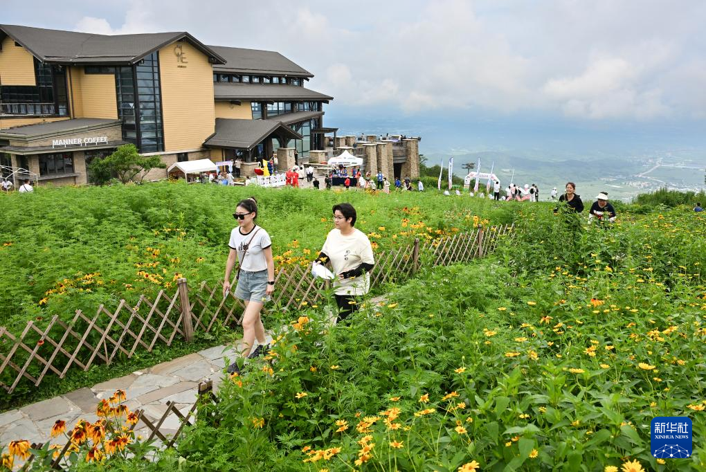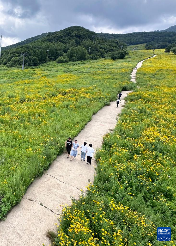 在吉林松花湖滑雪场内,冬季的雪道变身夏季的花海和小路,游客们徜徉其中(手机照片,8月3日摄)。