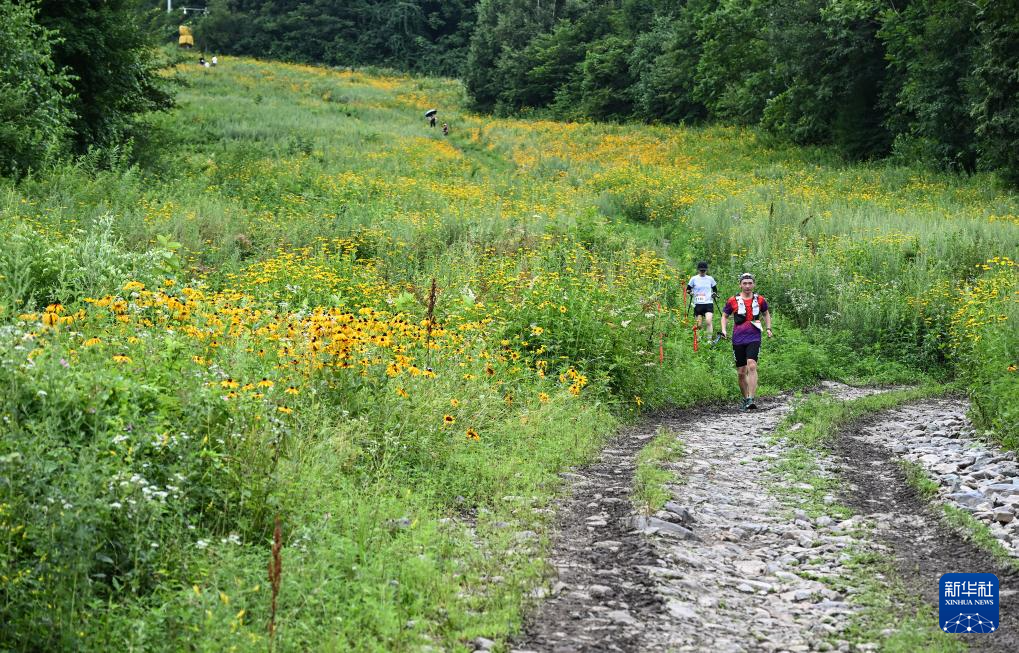 在吉林松花湖滑雪场内,冬季的雪道变身夏季的花海和小路,徒步越野者在山间穿行(8月3日摄)。