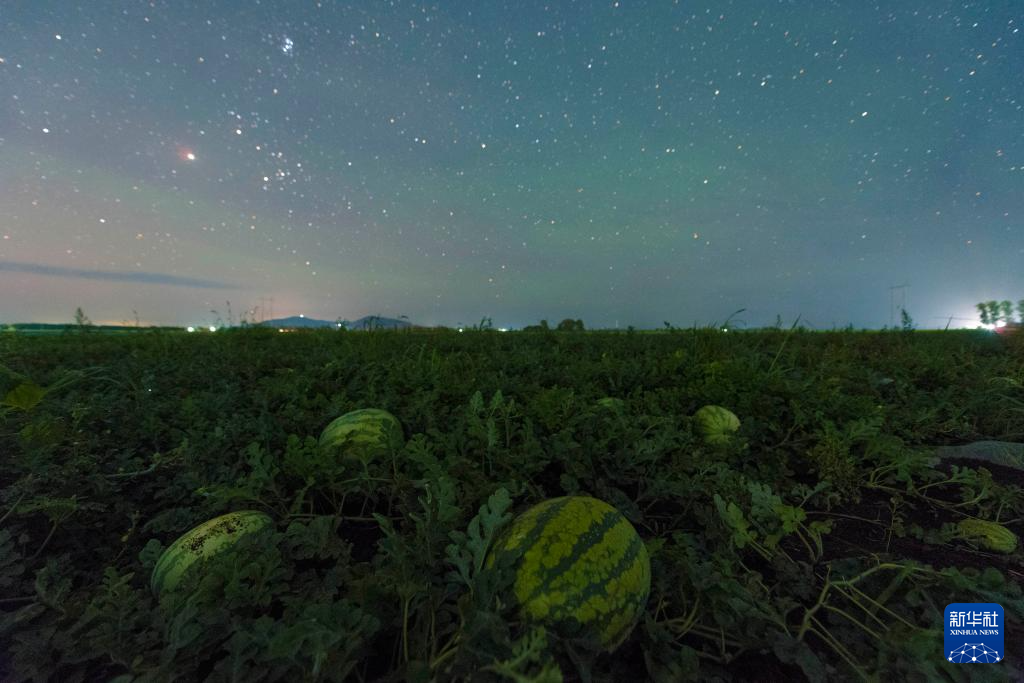 8月4日在黑龙江省富锦市大榆树镇互助村拍摄的星空下的西瓜地。