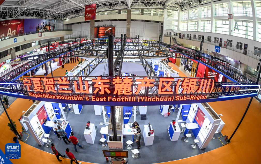 这是贺兰山东麓国际葡萄酒交易会现场设置的宁夏贺兰山东麓产区(银川)展示区(8月9日摄)。