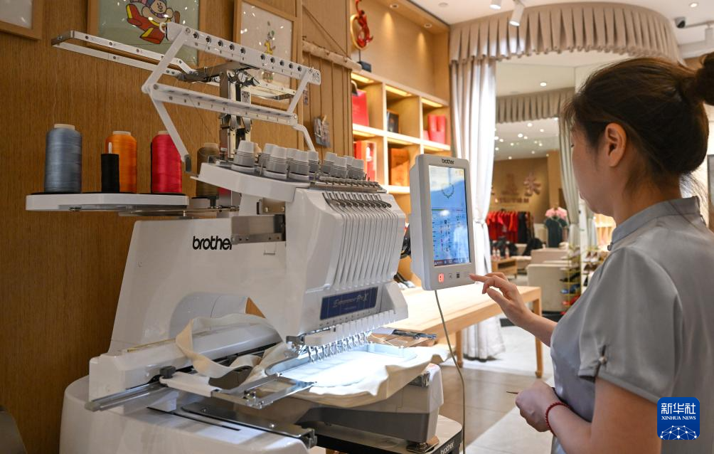 在老美华旗舰店,工作人员根据顾客喜好定制刺绣样式(7月15日摄)。