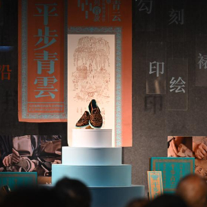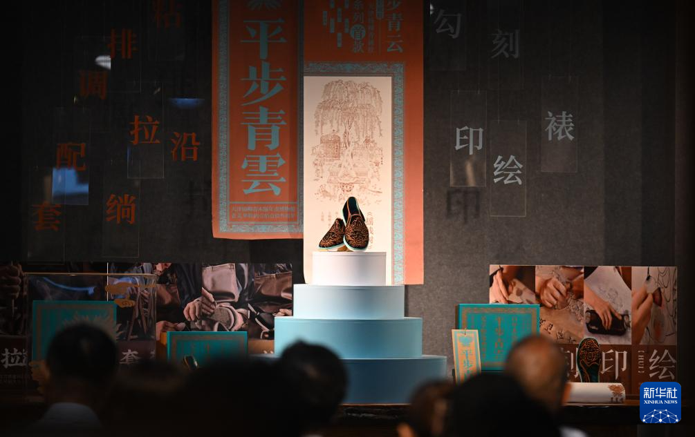 8月8日拍摄的老美华与天津杨柳青画社联名产品“平步青云”彩云鞋发布现场。