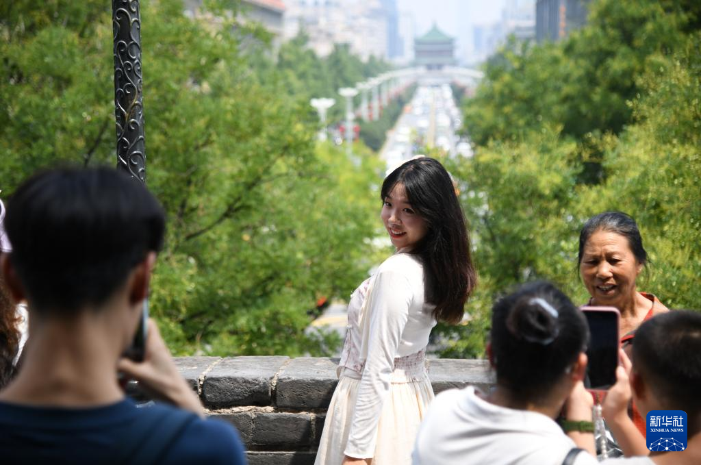 8月8日,游客在西安城墙景区游览拍照。