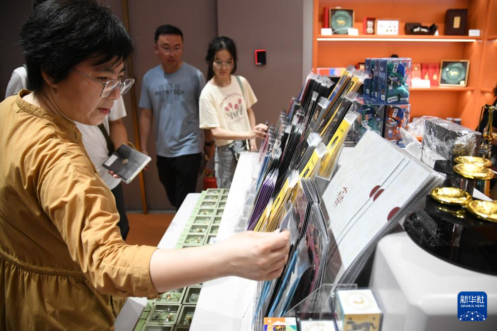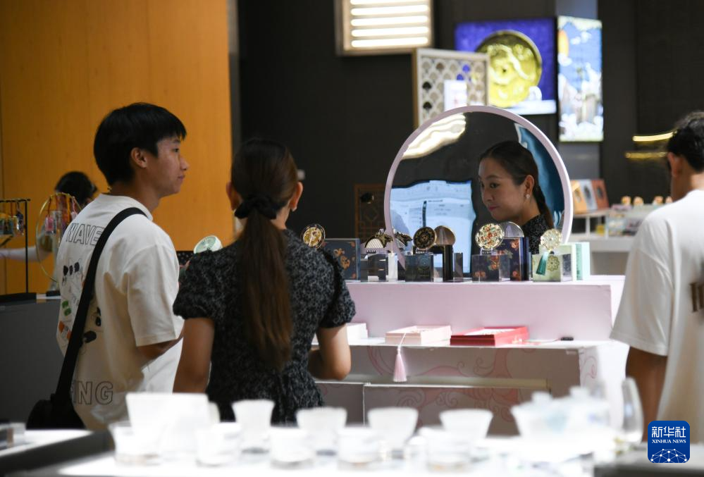 8月7日,游客在陕西历史博物馆秦汉馆选购文创产品。