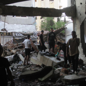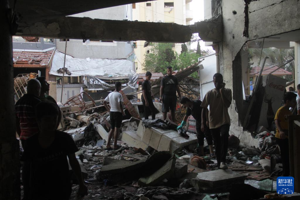 8月10日,在加沙地带北部加沙城,当地居民查看以军袭击后的废墟。