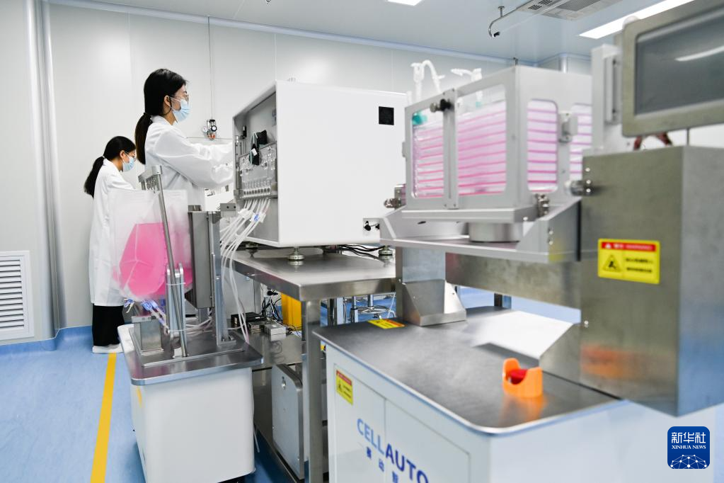 在位于哈尔滨新区的哈尔滨北科健康科技有限公司细胞制剂数字化智能化生产线,细胞制备工程师在进行设备调试工作(8月9日摄)。