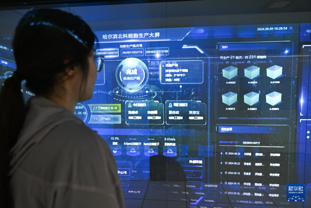 在位于哈尔滨新区的哈尔滨北科健康科技有限公司技术室,质量检测工程师在查看细胞生产大屏(8月9日摄)。
