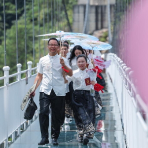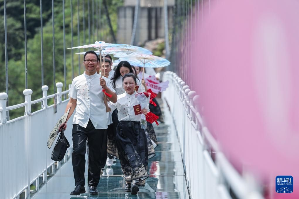 8月10日,新人们在临安太湖源景区的玻璃桥上完成“爱的告白”(无人机照片)。
