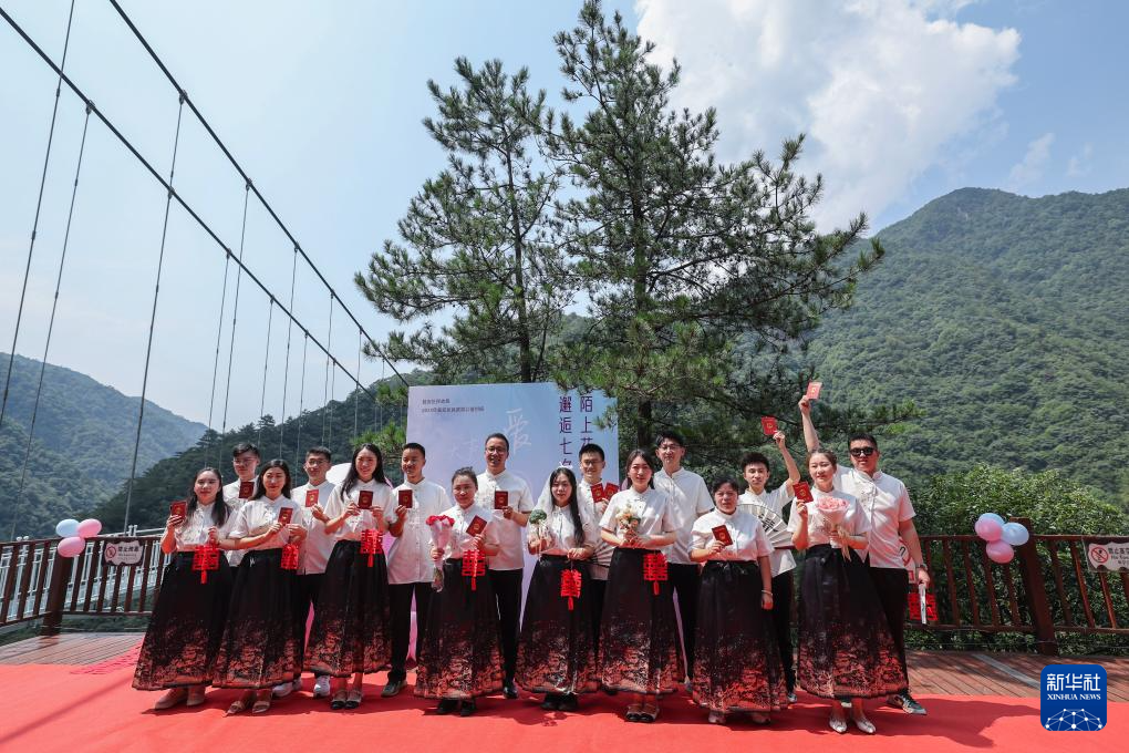 8月10日,新人们在临安太湖源景区参加“陌上花开·邂逅七夕”主题活动。