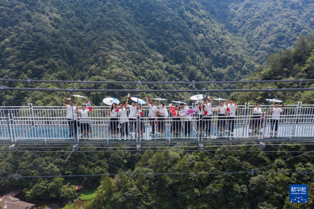 8月10日,新人们在临安太湖源景区的玻璃桥参加主题活动(无人机照片)。