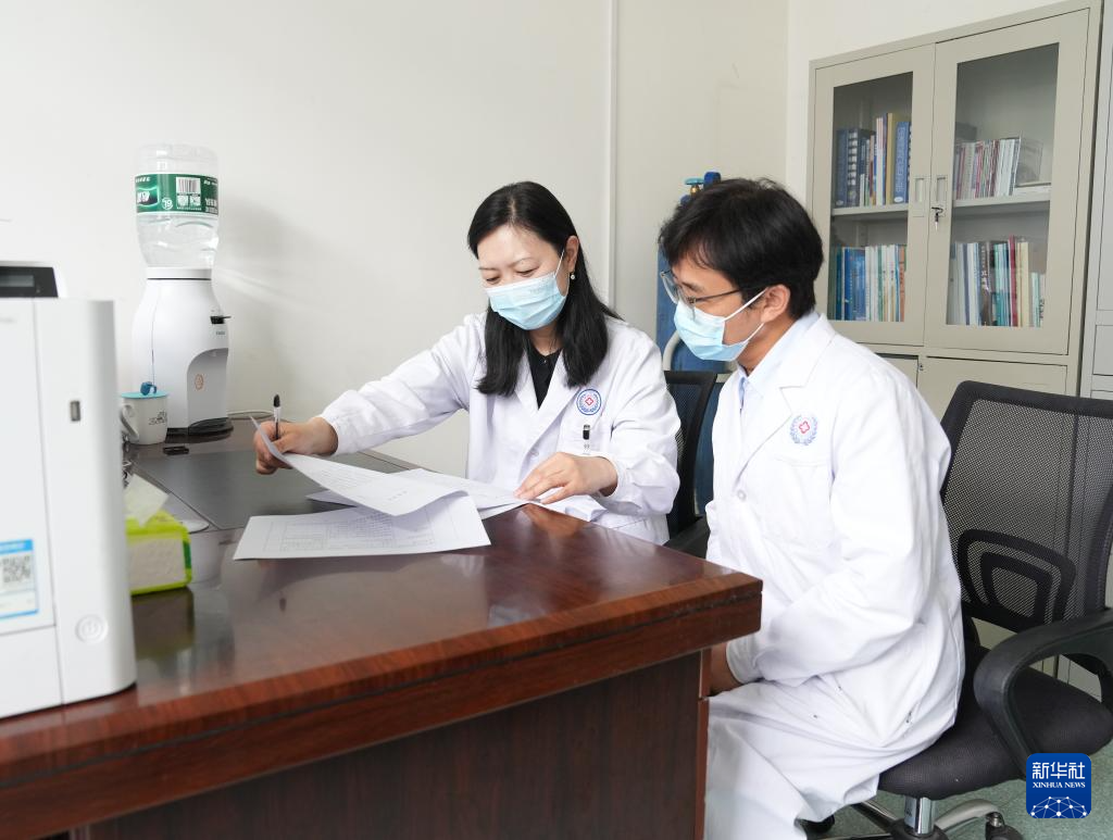 在西藏自治区人民医院,徐钟慧(左)与徒弟旦增晋美在办公室内交流(8月9日摄)。