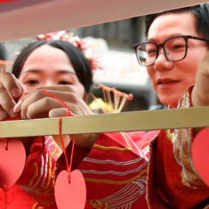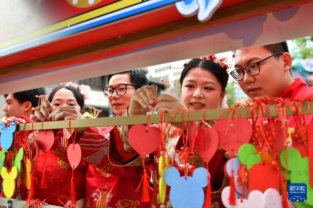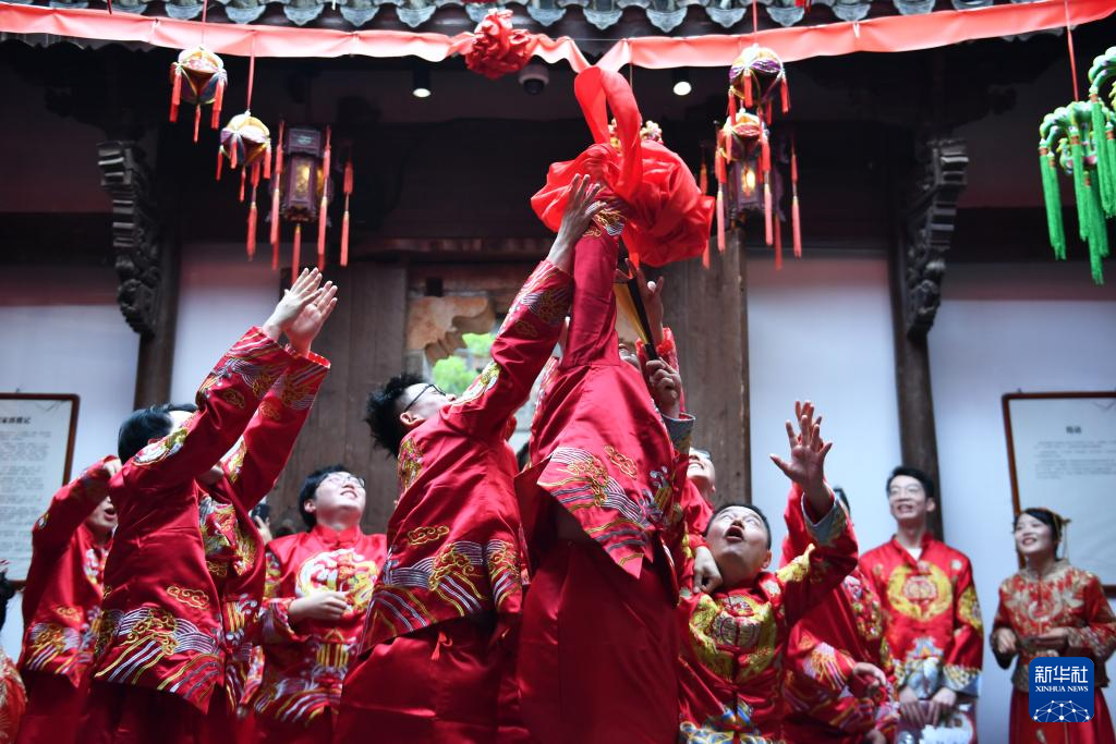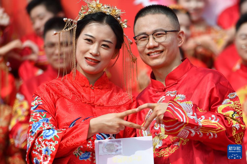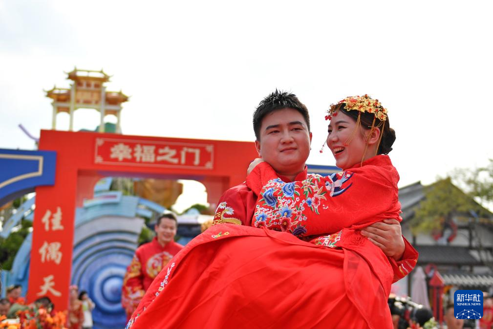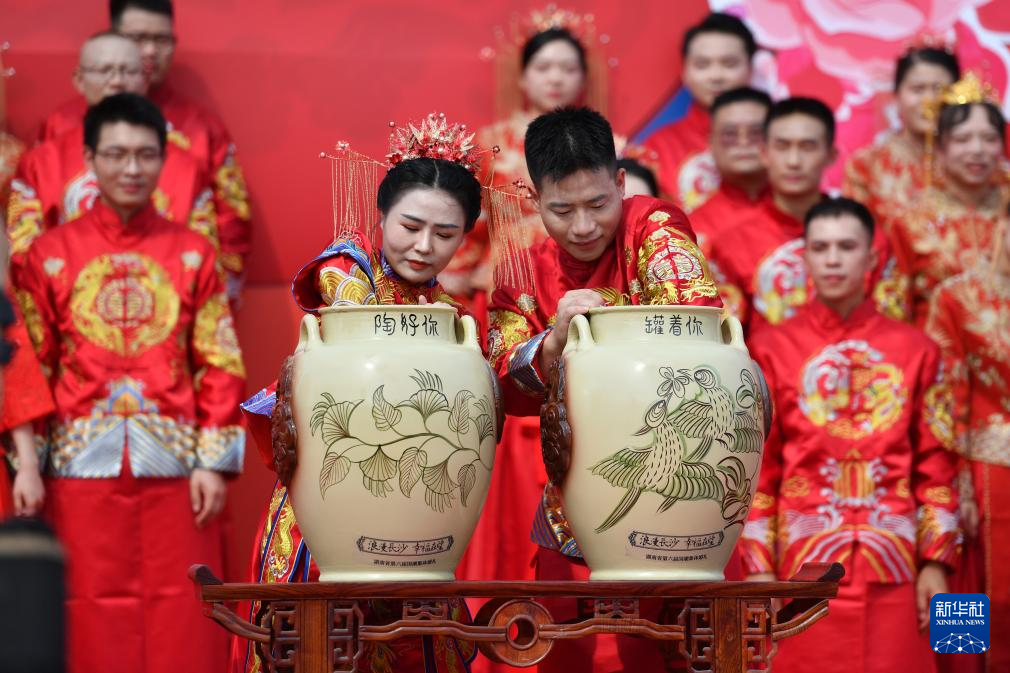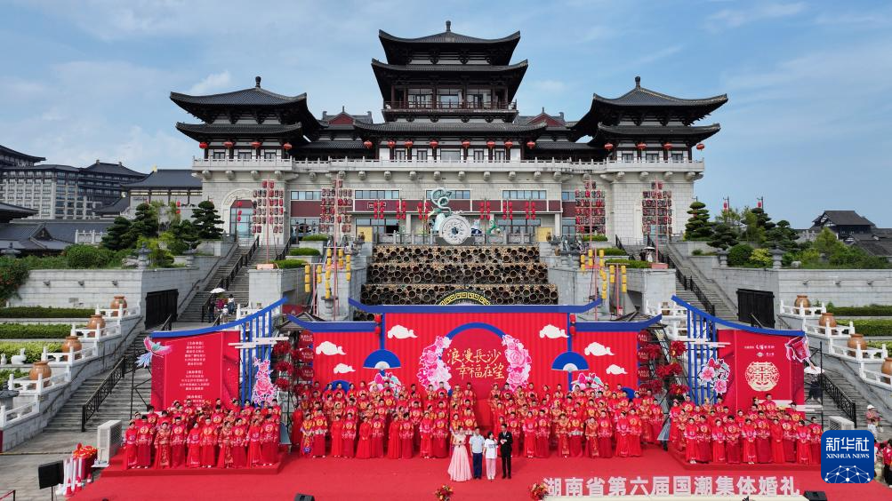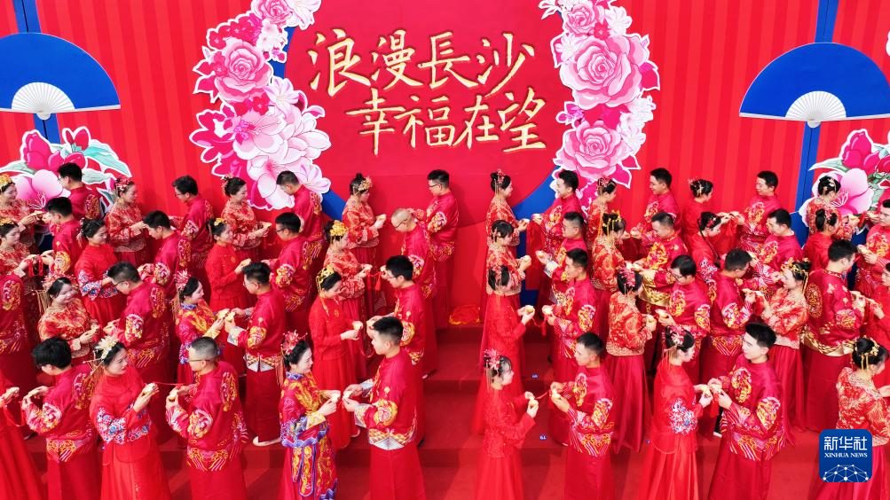 当日是七夕佳节,在湖南省长沙铜官窑文化旅游度假区,77对新人参加集体婚礼。他们身着中式喜服,携手步入婚姻殿堂。