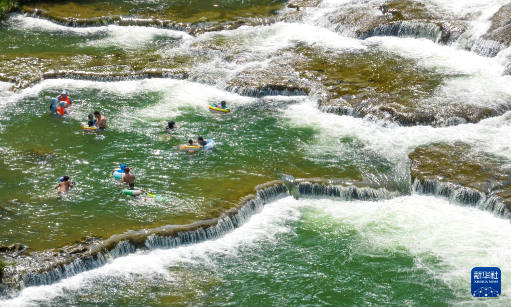 8月5日,人们在广西柳州市鹿寨县中渡镇响水瀑布景区戏水游玩(无人机照片)。