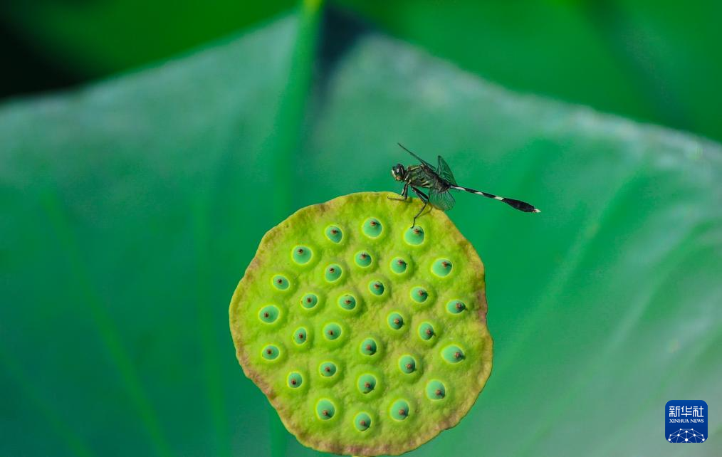 8月5日在湖南省常宁市柏坊镇新柏村拍摄的蜻蜓和莲蓬。