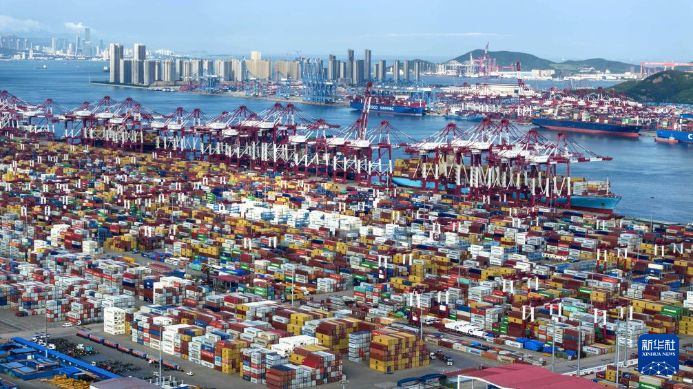 繁忙的山东港口青岛港前湾集装箱码头(8月6日摄,无人机照片)。