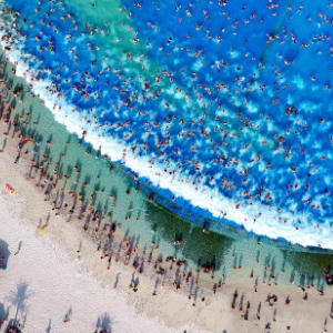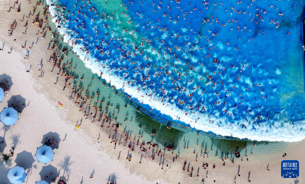 8月3日,游客在四川省泸州市纳溪区欢乐派海滩公园戏水游玩(无人机照片)。