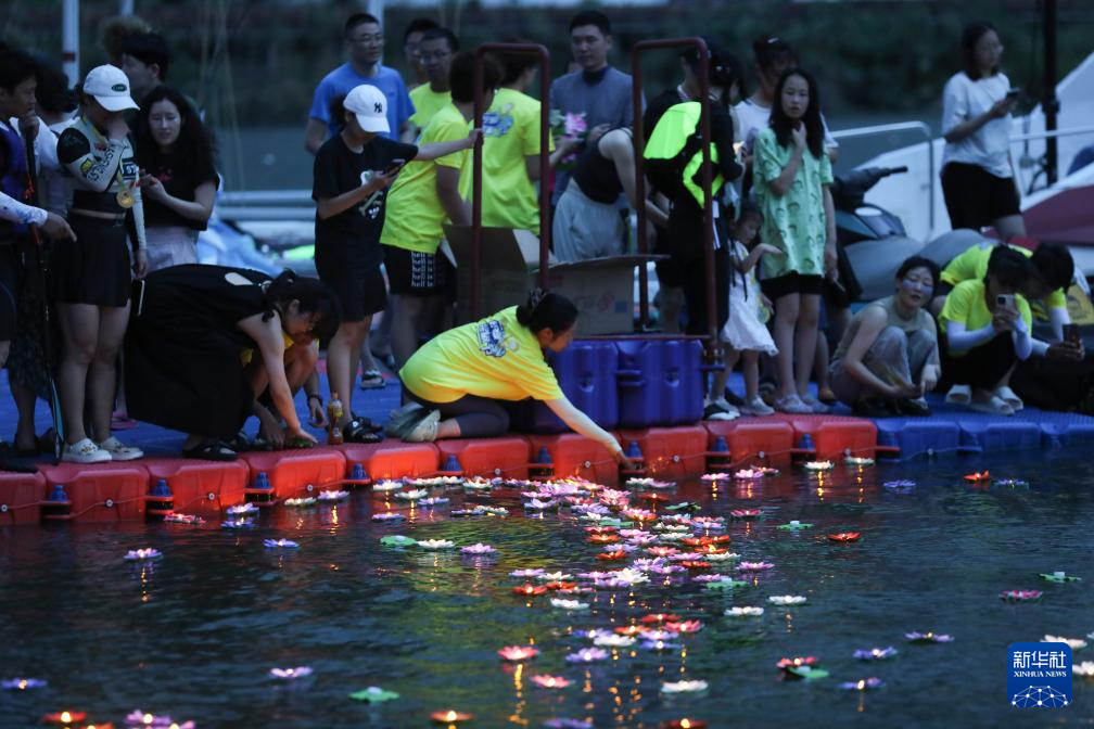 8月10日,在淳安县里商乡湖边,人们将写下心愿的荷灯放入湖中,祈求姻缘美满。