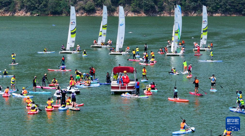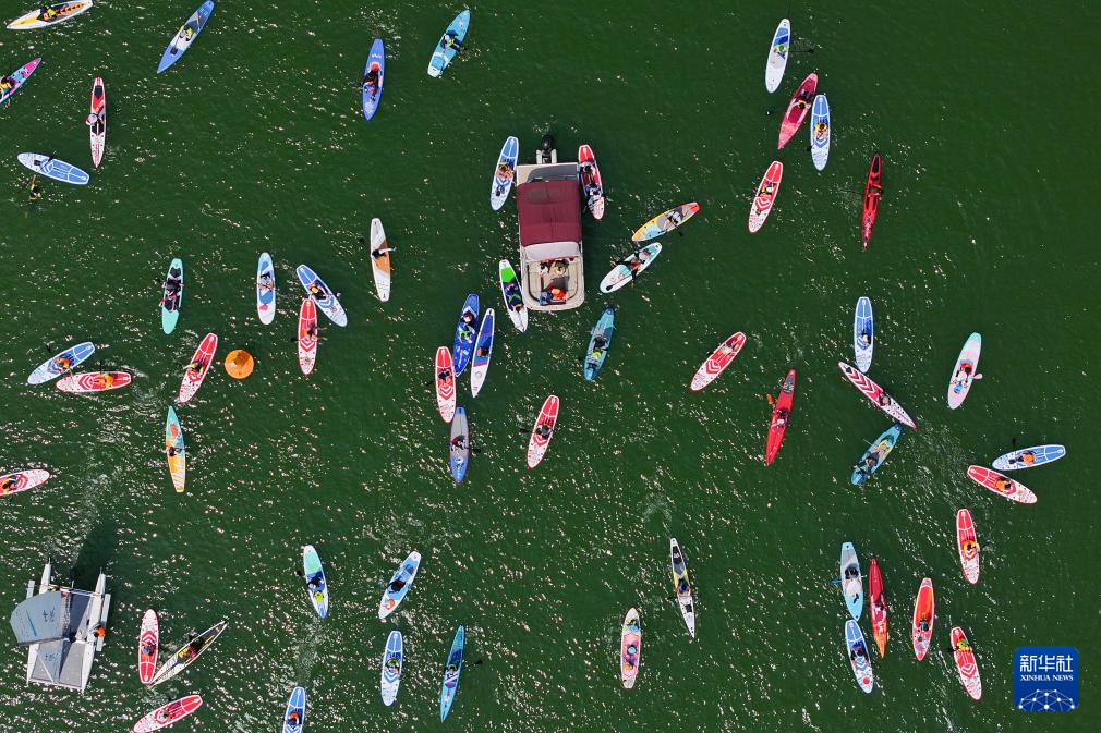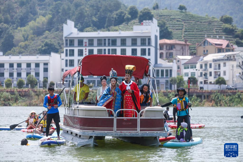 8月10日,在千岛湖面上,桨板运动爱好者以桨板水上迎亲的方式将水上运动与传统民俗相结合,为单身青年男女打造浪漫独特的交友及文化体验平台。