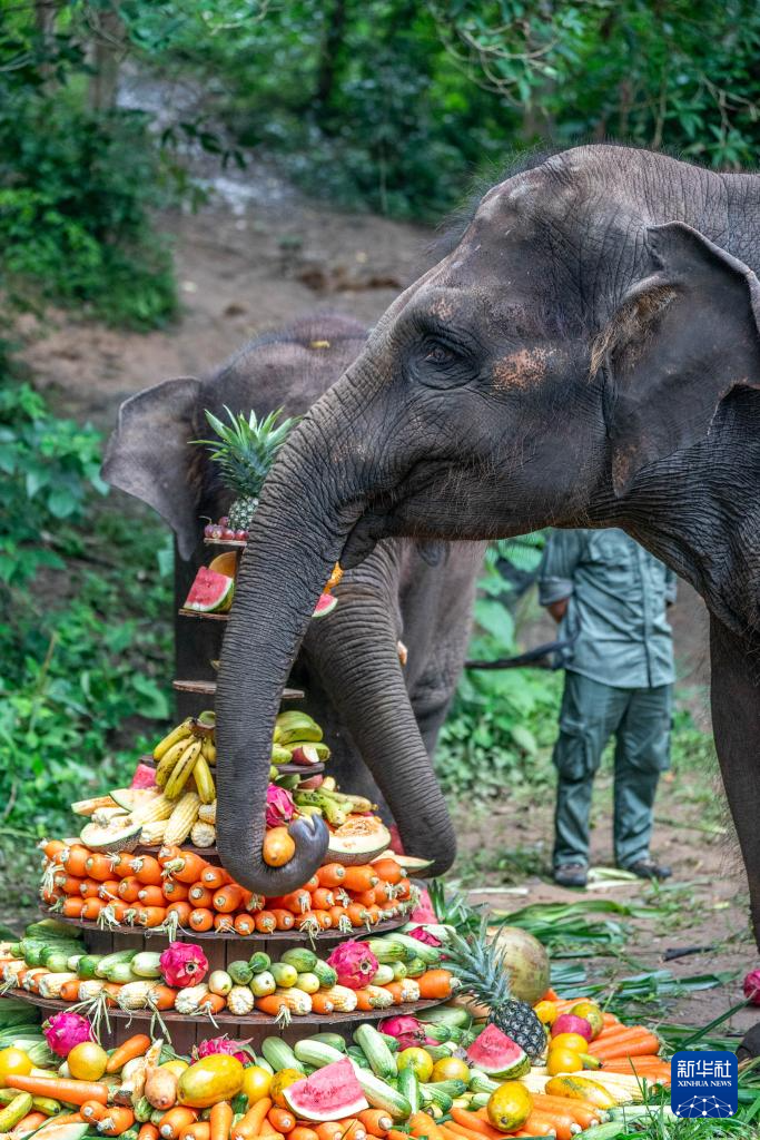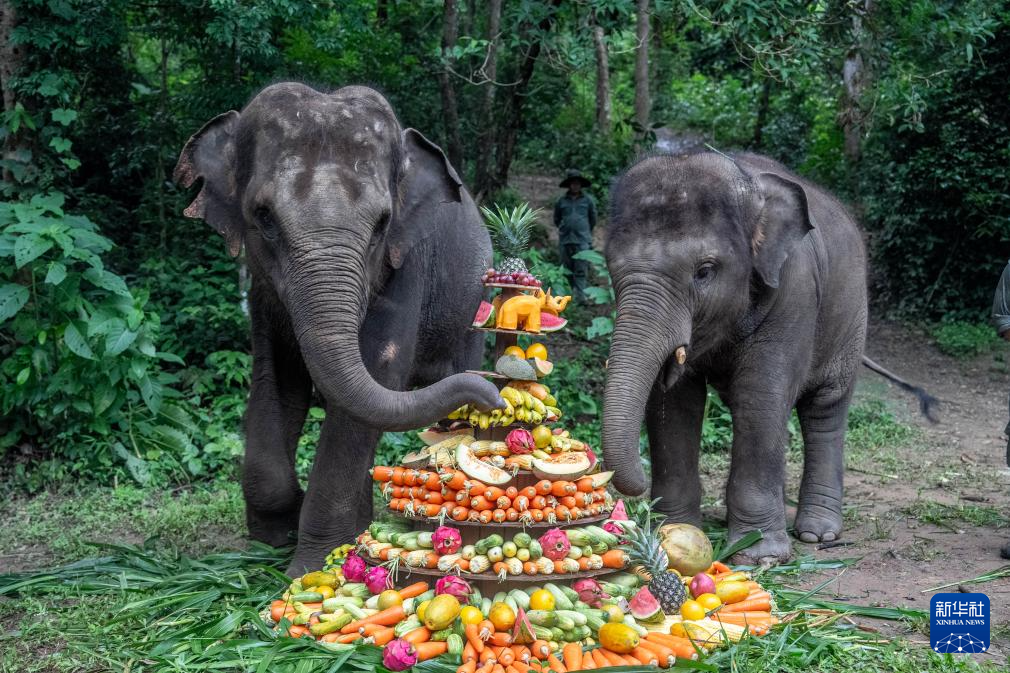 8月12日,野象羊妞(左)和小伙伴龙龙一起品尝自己的9岁生日宴。