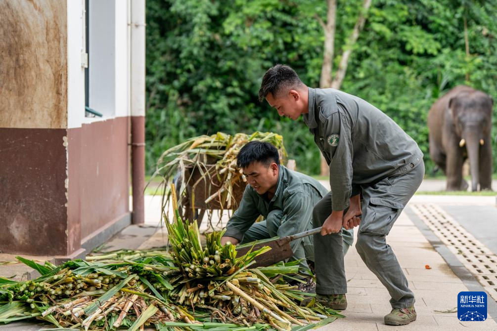 8月8日,“象爸爸”在给龙龙切晚餐食用的象草,龙龙在远处观看。