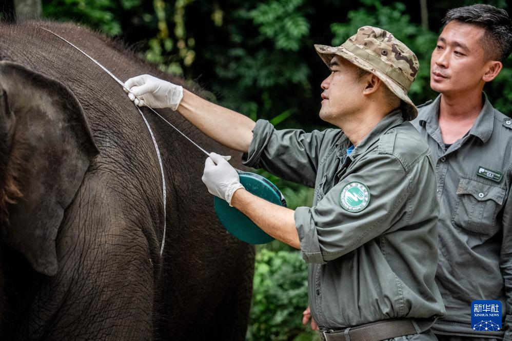8月8日,“象爸爸”陈继铭(左)在给龙龙体检。