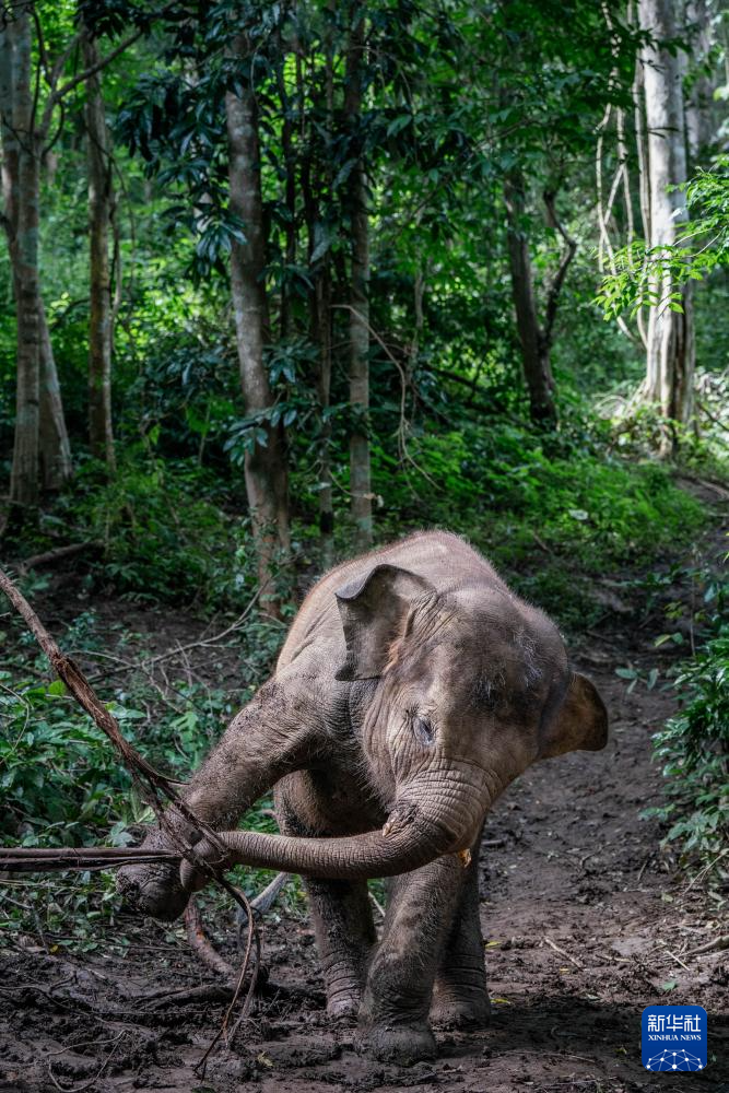8月5日,野象龙龙在野外玩藤蔓。