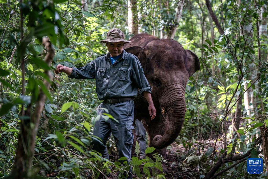 8月5日,“象爸爸”陈继铭带龙龙进行野化训练。