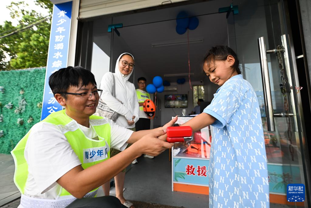 8月12日,在海陵区东河小游船码头“青少年防溺水救助站”旁,小朋友体验水下救生速浮手环。防溺水专班人员向群众免费提供户外游泳浮漂、水下救生速浮手环等设备。