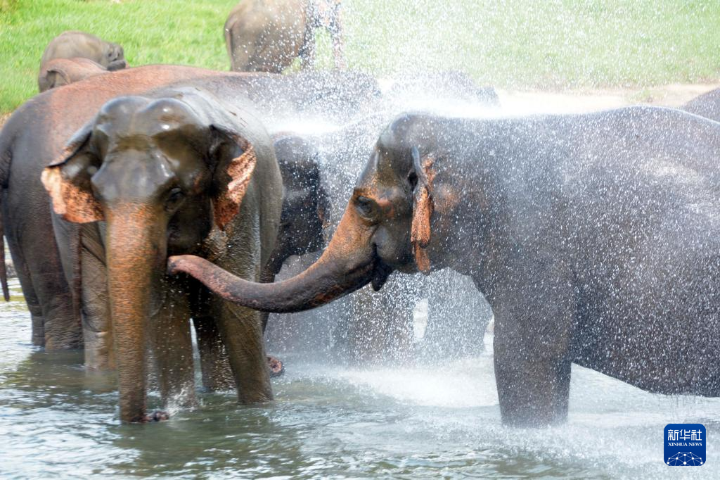 8月10日,游客在斯里兰卡平纳维拉大象孤儿院同大象互动。