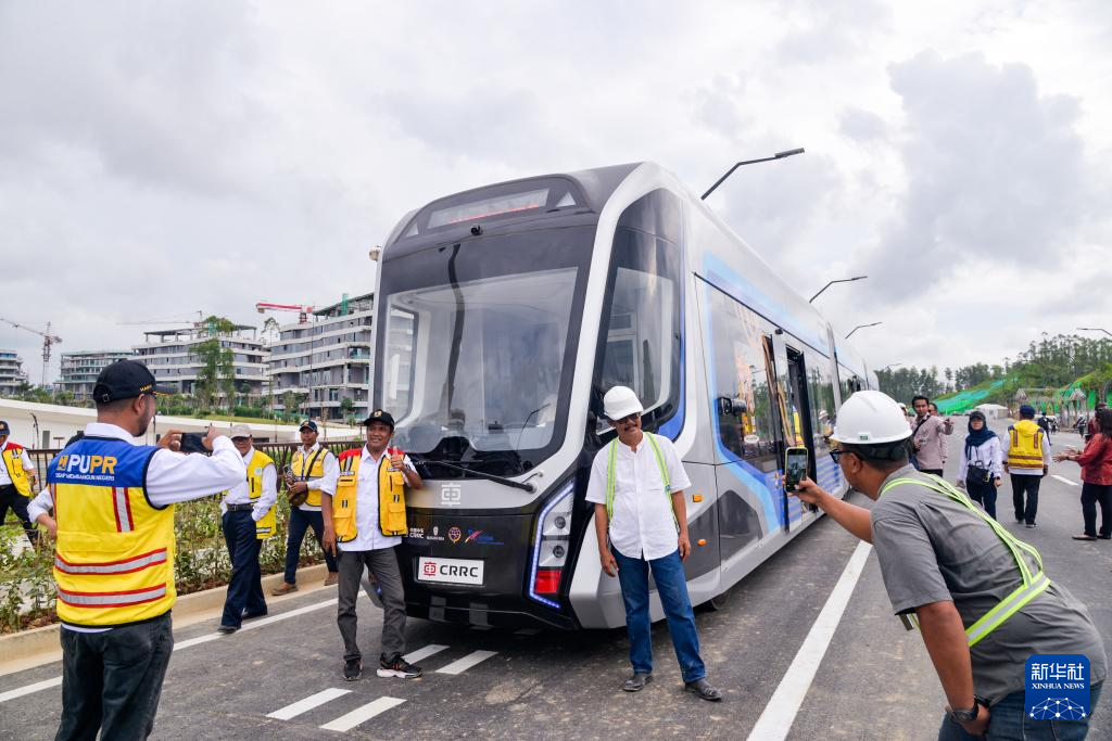 8月13日,在印度尼西亚新首都努山塔拉,工作人员和智轨系统合影。