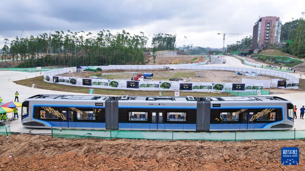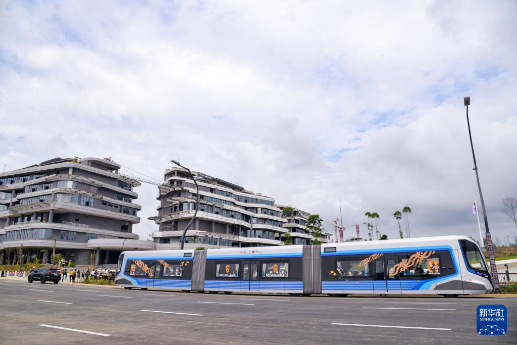 这是8月12日在印度尼西亚新首都努山塔拉拍摄的智轨系统。