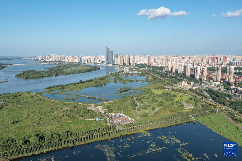 这是哈尔滨群力外滩生态湿地公园一角和周边城市景观(8月13日摄,无人机照片)。