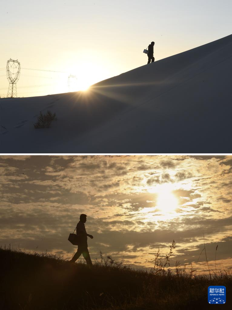 拼版照片:上图为2018年1月25日,梁春荣出诊时行走在“沙坨子”里;下图为2024年8月13日,梁春荣在出诊路上,曾经翻越的“沙坨子”如今已是草地。