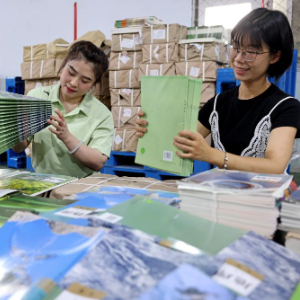 8月14日,在湖南省资兴市新华书店教材仓库内,工作人员在分拣教材。