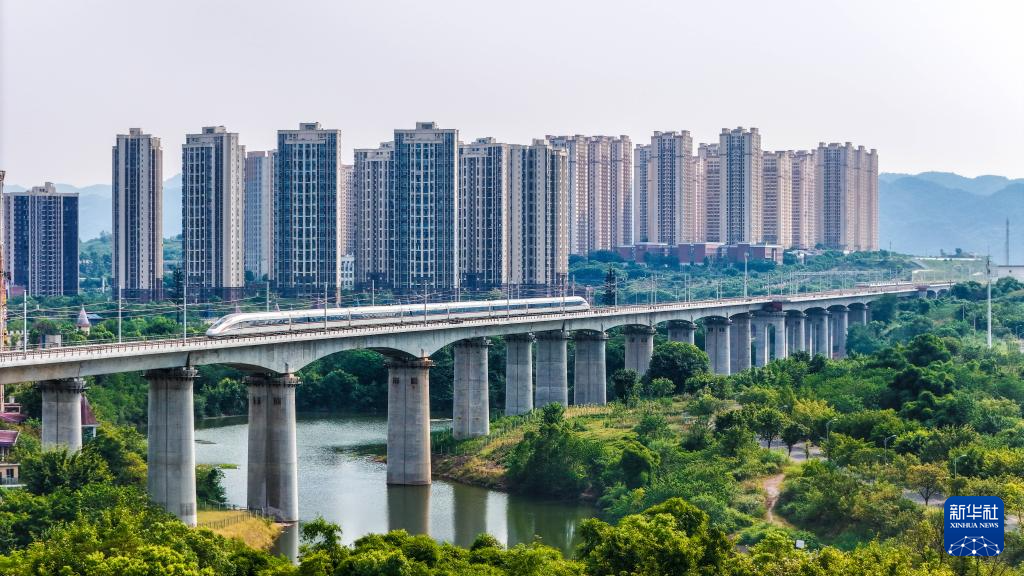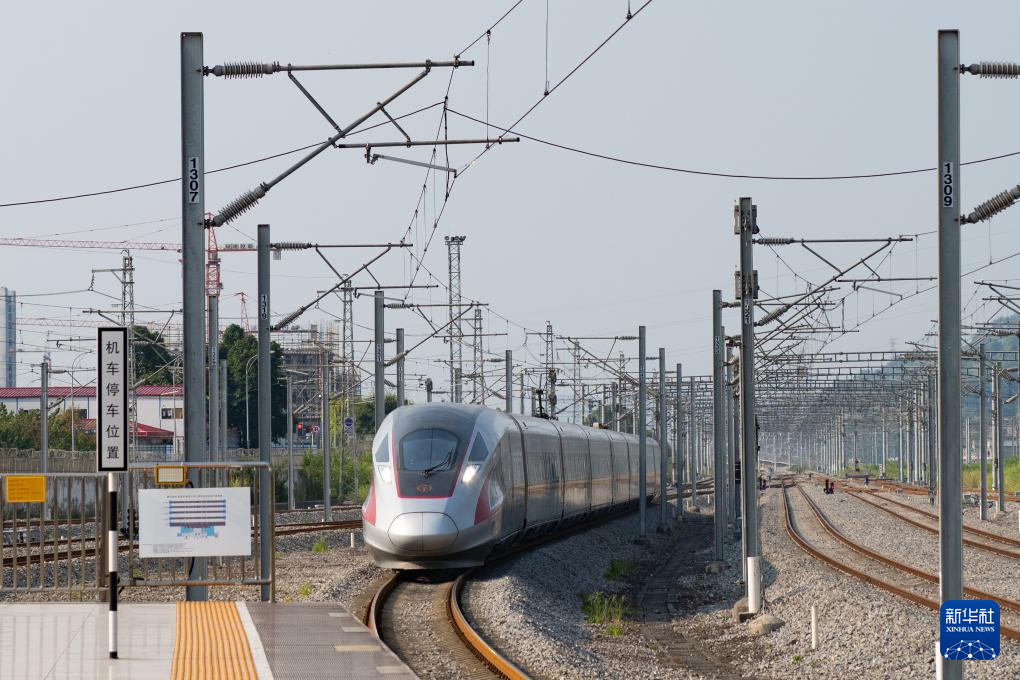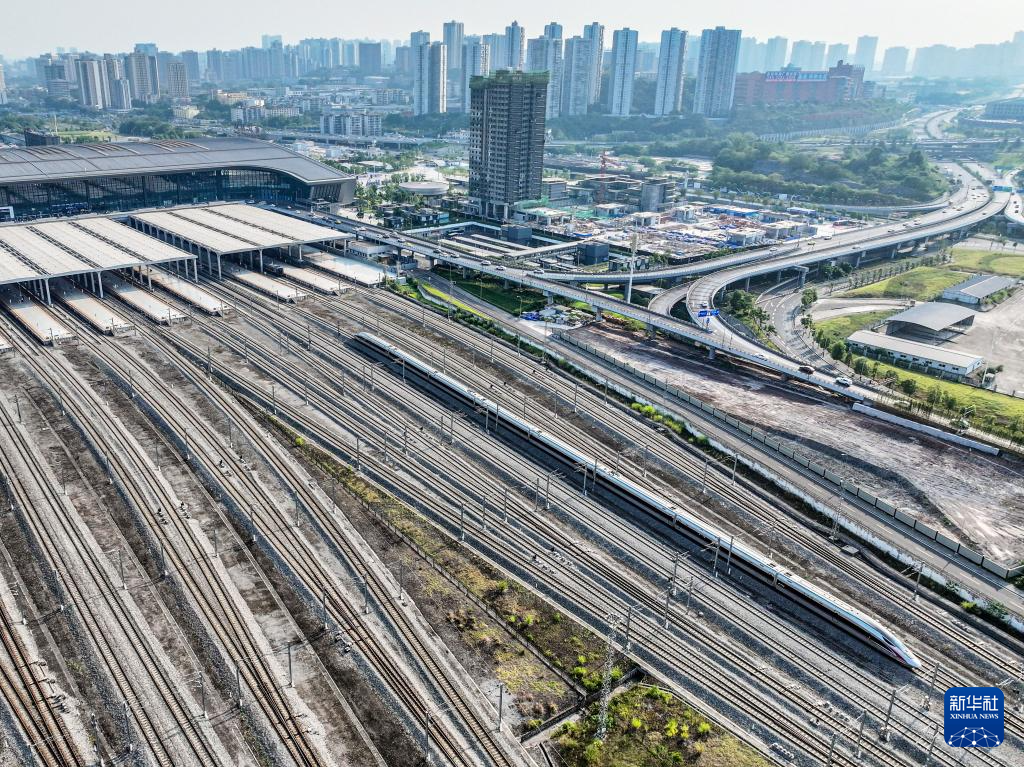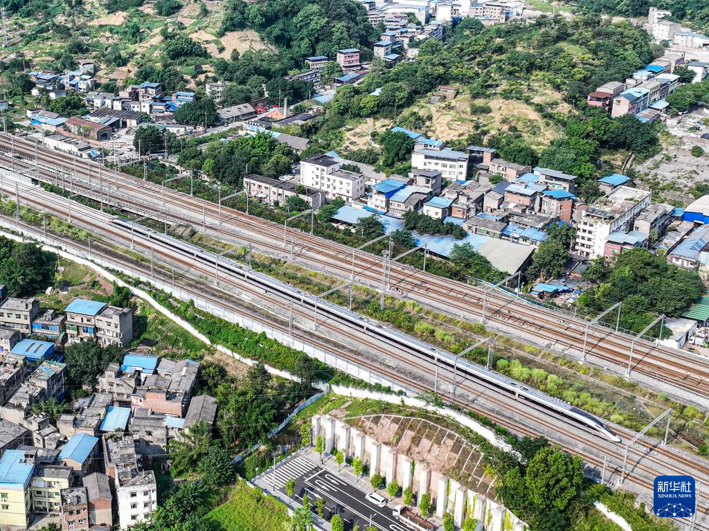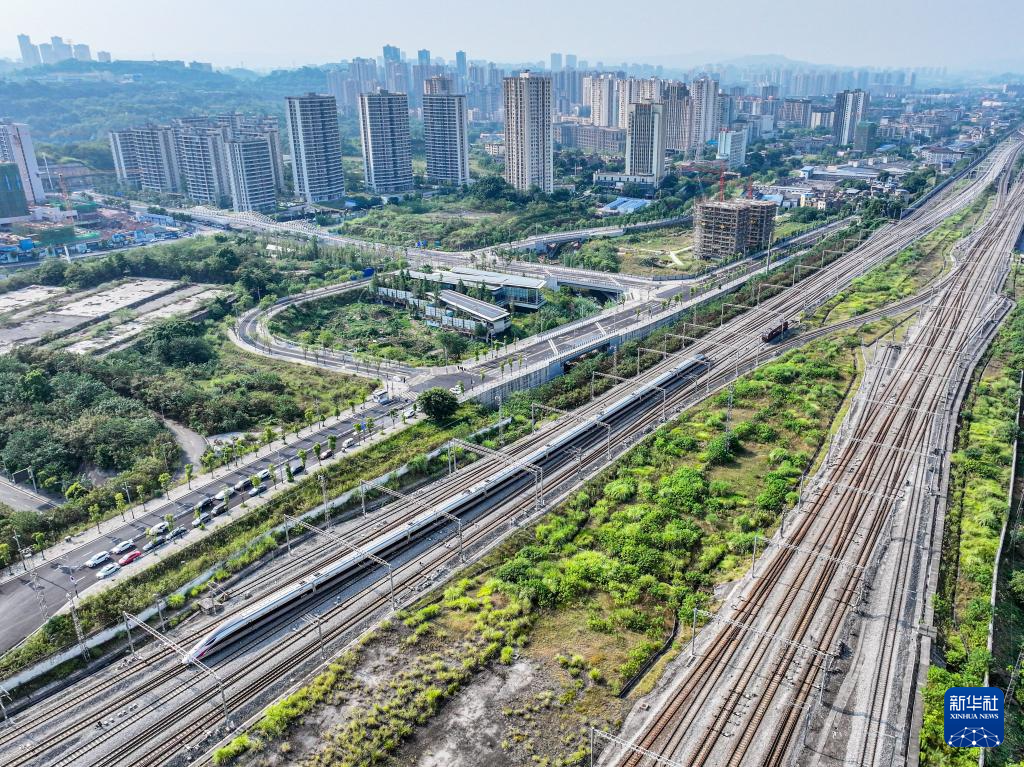 8月16日,渝昆高铁渝宜段进入运行试验阶段,检测车从重庆西站驶出(无人机照片)。
