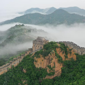 这是8月16日拍摄的云雾中的河北省遵化市古长城景色(无人机照片)。