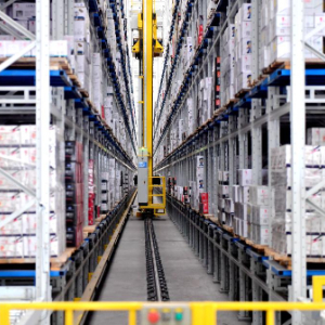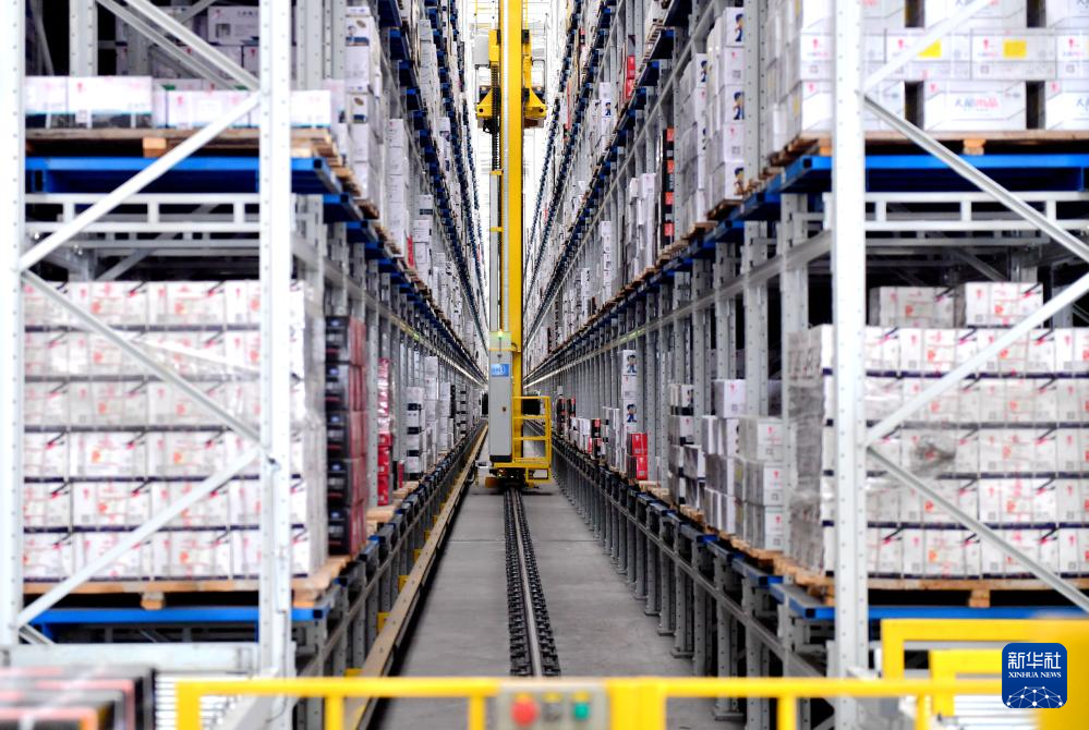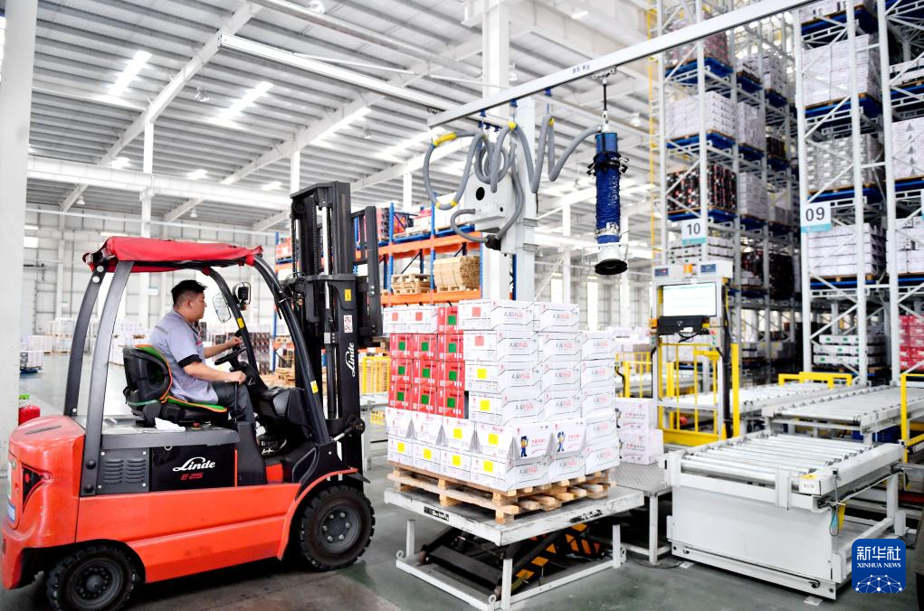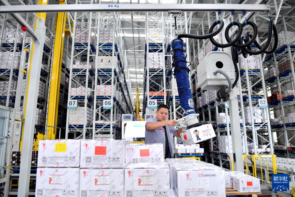 8月16日,在邯郸市永年区一家紧固件生产企业,工人在智能仓储车间内装卸货物。