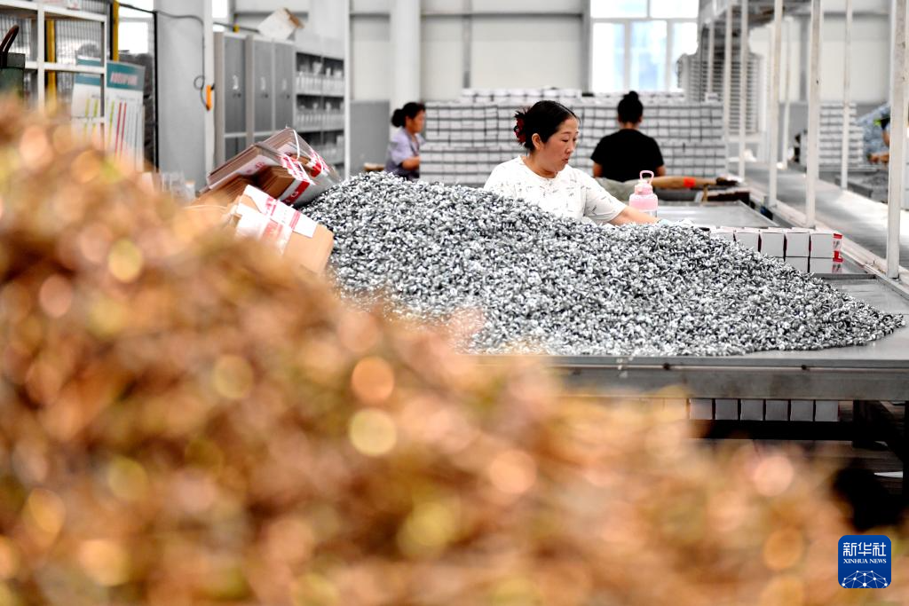 8月16日,在邯郸市永年区一家紧固件生产企业,工人在包装车间内工作。