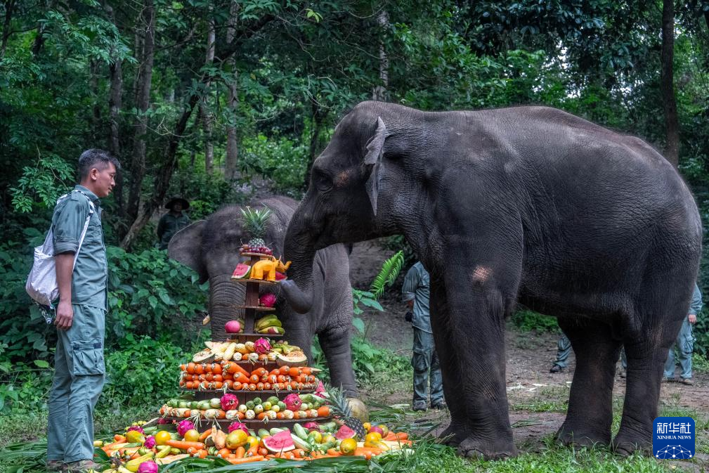 8月12日,野象羊妞(右)在自己的9岁生日宴上。