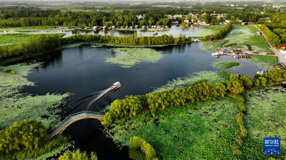 这是济宁市微山县驩城镇微山湖二级坝湿地公园景色(8月13日摄,无人机照片)。