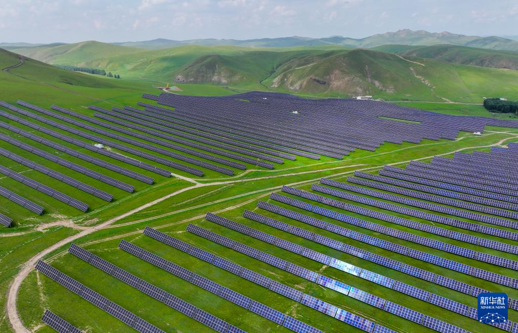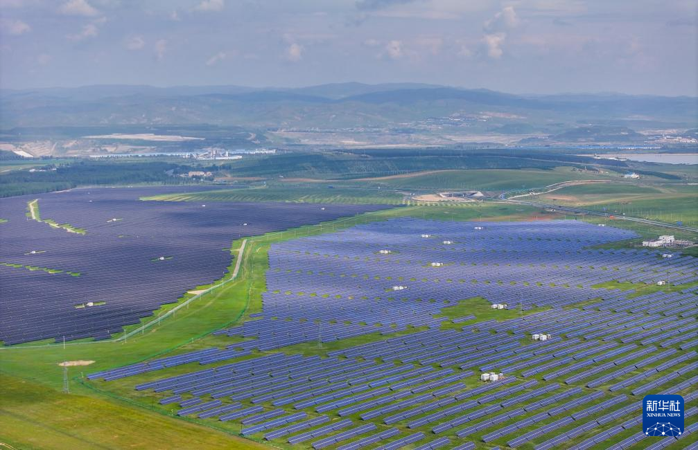 这是8月17日拍摄的内蒙古通辽市霍林郭勒100MW复合光伏项目(无人机照片)。