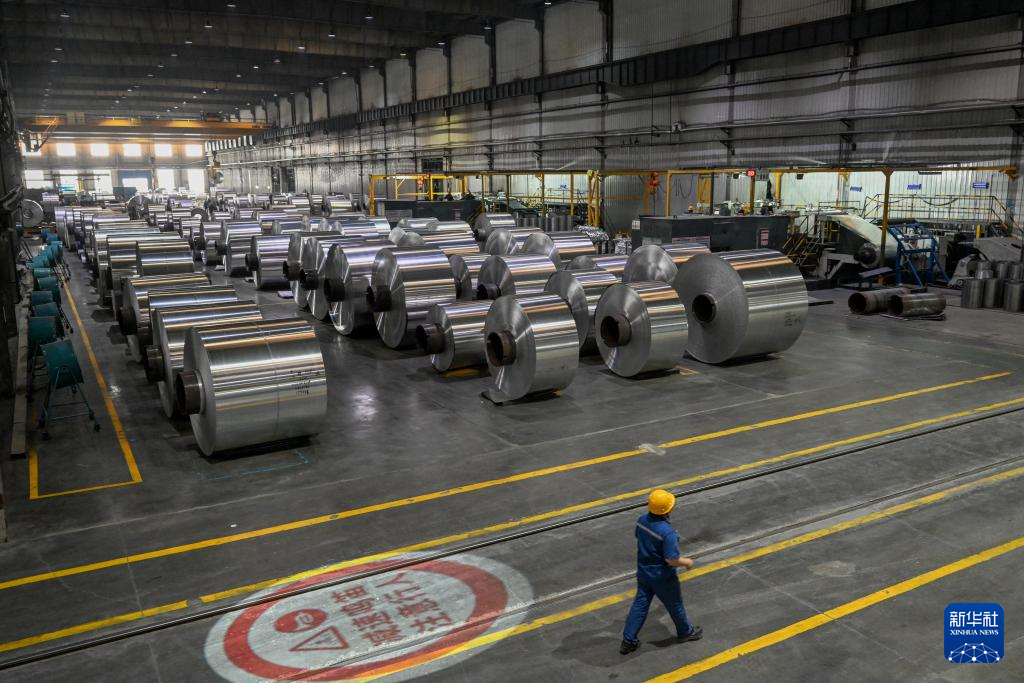 8月17日,在内蒙古通辽市霍林郭勒联晟新能源材料有限公司厂房内,工作人员吊装铝箔卷。