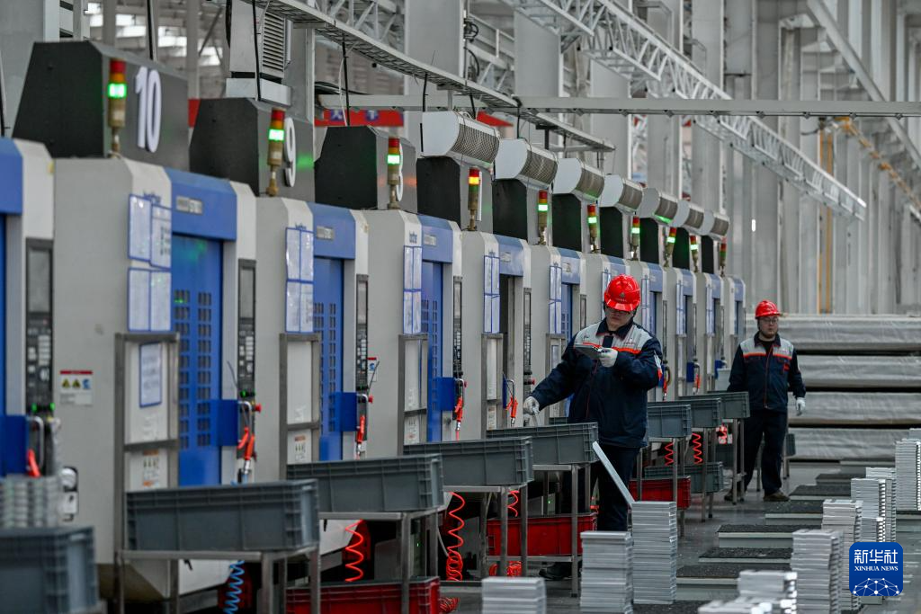 8月17日,在内蒙古通辽市霍林郭勒一家轻量化新材料公司厂房内,工作人员加工铝材料部件。